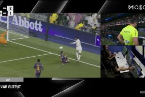 体育资讯10月27日讯 西甲第10轮国家德比,皇马对阵巴萨。48分钟,贝林厄姆传中,皮球反弹打到加西亚手上。皇马球员抗议手球,裁判没有判罚。VAR介入,裁判亲自观看回放。