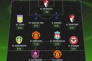 中场:布伦登-阿隆森(利兹联,8.58分)、姆伯莫(曼联,9.16分)、索博斯洛伊(利物浦,8.40分)、沙德(布伦特福德,8.29分)
