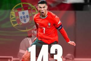 C罗国家队生涯225场打进143球,继续领跑国家队历史射手榜,领先第二梅西29球!